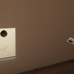 The white wedge object protrudes from the wall, its chalky texture conflates its physicality with the wall surface; a shift made congruent through a shadow that meshes the two surfaces. This shadow from the top point of the wedge as it is positioned against the wall creates another triangle shape that flows down the wall into what can only be called a distortion in the sense that something has been stretched (not unlike those fairground mirrors that stretch and distort the human body). Yet this shadow breaks into a kind of doubled shadow; two tones of shadow offset. At this point the gap in the cast thong is pronounced as a separation of both object and shadow, so much so that the shadow when momentarily taken in isolation becomes an independent object; an object that is itself situated in this gap between indexicality and an excised symbolic from the real.